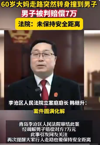 近日,山东青岛李沧区,一普法案例中,女子刘某和男子王某在人行道一前一后同向而行,刘某在前边走边接听电话,突然转身,撞上了王某,刘某当场倒地,后经检查右股骨胫创伤性骨折。二人就赔偿数额无法达成一致意见,诉至法院。伤情鉴定结果显示,女子刘某十级伤残,又因其年近60,骨折对身体的影响程度较大。法官调取监控记录,表示刘某虽受伤,但在前方无突发情况的状态下突然转身向回走,对于事故的发生存在较大过错;王某存在未保持安全距离的过错,系事故发生的次要原因。经多次调解,最终双方达成一致,由王某赔偿刘某70000元。——@LQ0068:这不是被老人讹上了,而是被法律讹上了 …… 世风日下,皆在于国人惧被法律讹上更甚于被老人讹上 ……