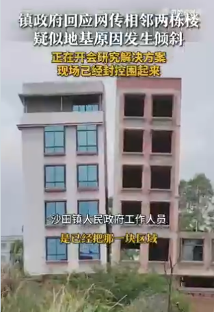 近日,广西玉林,网传福绵区沙田镇的两栋楼疑似地基原因发生倾斜。镇政府称倾斜楼栋已封控正研究解决。——@Tonyliu395995:墙国的豆腐渣工程是全方位无死角,总有一款等着你,领导正在商量该谁来背锅。