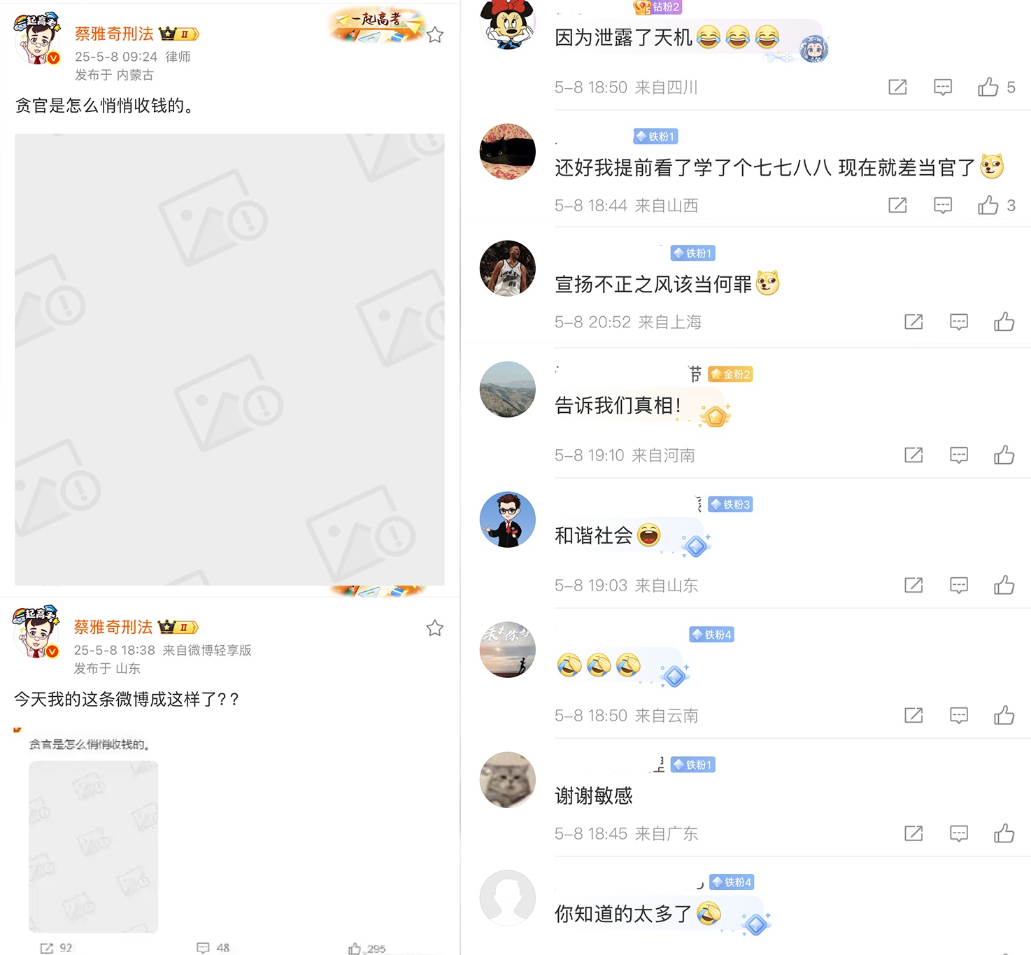 5月8日,一张题为《贪官都是怎么悄悄收钱的》的图片在社交平台传播,该图用低、中、高三层次总结概括了官员贪污的手段。目前该图已被微博屏蔽。遭到此情况的刑辩律师蔡雅奇发文问:“今天我的这条微博怎么成这样了?”一名网友回复:“因为你泄露了天机”