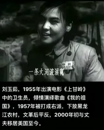 《上甘岭》电影中唯一的女性角色,扮演女卫生员王兰的刘玉茹女士,1955年演打美帝,1957年反右运动被打成右派。 1958年刘玉茹女士被发配到哈尔滨郊区当农民。 现已旅居美国,安享晚年。 多少革命的英雄儿女,最终都投奔了美帝安享晚年。