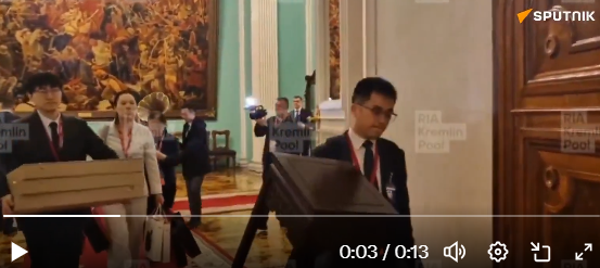 陪同习近平主席访问的中国代表团,带到克里姆林宫的一份礼物是一台由深色木材制成的大型留声机,装饰有东方风格的花鸟微型图案,以及其他纪念品。除了留声机,代表团还带来了一张雕刻精美、具有中国风格的桌子,以及其他小礼品,这些物品都被细致地包装在礼盒中。
