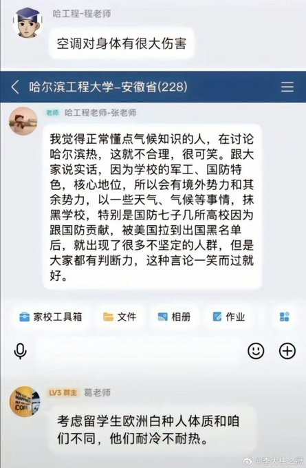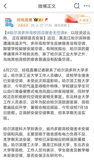 近日,哈尔滨遭遇夏季异常高温。2025年6月下旬,哈尔滨遭遇罕见持续高温,体感温度达37-38℃,地表局部超65℃。宿舍夜间23点断电导致风扇无法使用,闷热难眠,“不动也出汗”,多名学生出现失眠、中暑症状。学生们校内自救:在楼道、天台、操场打地铺,宿舍内搭帐篷,用冰块或凉水泡脚降温。校外住宿:周边酒店全部满房,4公里外房价飙升至300元/晚,部分学生被迫返回宿舍。当地高校有学生要求学校加装空调,学校是否安装空调需“看学校计划和安排”,未承诺具体时间表。但是学生们却得到老师的各种奇葩回应。