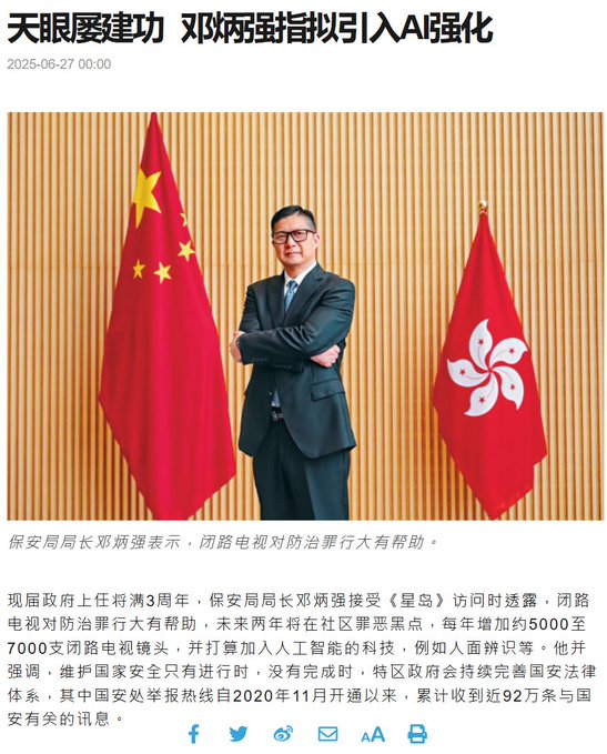 6月27日,香港保安局局长邓炳强接受采访时表示,未来两年将在香港新增5000-7000支监控摄像头,并打算引入AI功能强化人脸识别监控。