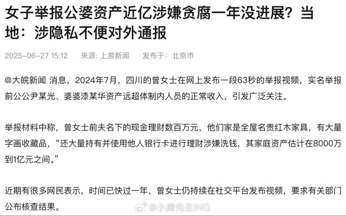 2024年7月,四川的曾女士实名举报前公公、婆婆资产远超体制内正常收入,称“他们家是全屋名贵红木家具,有大量字画收藏品,其家庭资产估计在8000万到1亿元”,引发关注。时间快过去一年,当地回应,“调查结果已经有了,但不能公开,因为涉及隐私,不太方便”。