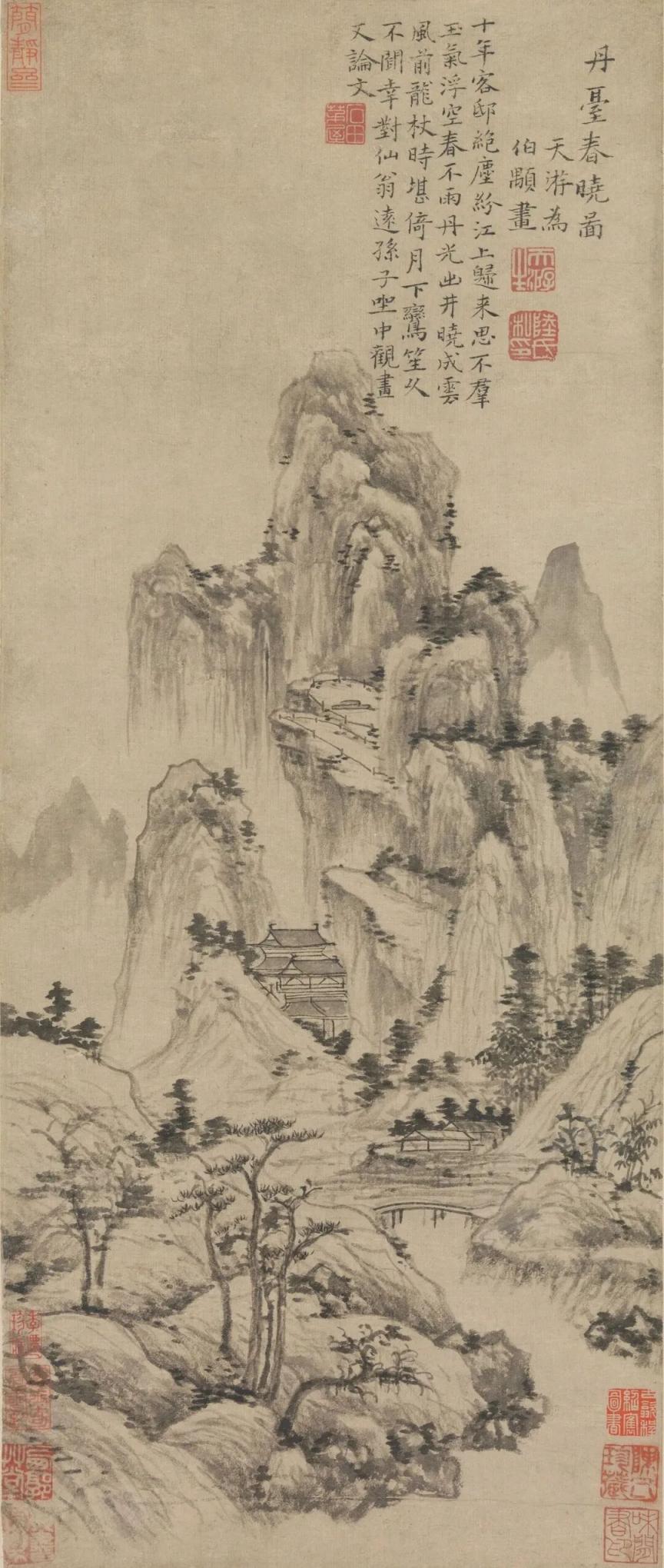 款识:丹台春晓图。天游为伯颙画。十年客邸绝尘纷,江上归来思不群。玉气浮空春不雨,丹光出井晓成云。风前龙杖时堪倚,月下鸾笙久不闻。幸对仙翁远孙子,坐中观画又论文。